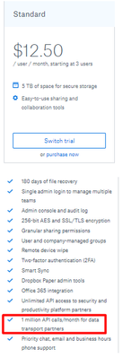 1 million API calls/month for data transport partners for the Standard Dropbox