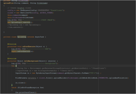 I notice you did say that 'the second time only the first one "First Phase" appear', and that 'It look like the async task doesn't start', so it does sound like the issue you're seeing has to do with running the AsyncTask itself, before the Dropbox method is even called. (That is, since the Log call in doInBackground is before the Dropbox call.) I'm afraid I can't offer help with that though, since it has to do with Java/Android itself, and not the Dropbox call in particular.