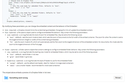 If you look at the Dropbox embedder API page here (screenshot attached): https://www.dropbox.com/developers/embedder Scroll about 70% down the page, below the JavaScript code you should see a s...