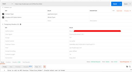 6 years agoVictorNemiro In your screenshot, I see you're setting the "Dropbox-API-Select-Admin" header value to "Whole Team", but you should actually be setting it to the relevant team member ID value.