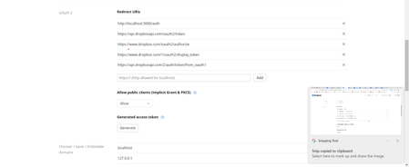 https://www.dropbox.com/oauth2/authorize?token_access_type=offline&response_type=code&client_id=<App key>Where "<App key>" is the one from you previous browser window. Next the confirmation you will get a code (alphanumeric sequence). The same could be received automatic when redirect URL is in use (either direct or PKCE code flow), but here we will perform it in such a way for clarity.