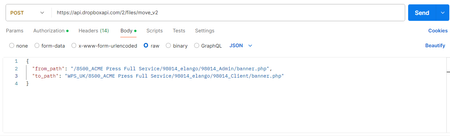 1 year agoYes, using the /2/files/move_v2 functionality is the right way to move files or folders from one path to another. Check out that documentation for information on that endpoint, as well as the "Path formats" documentation for information on how to format path values. For instance, I notice that your "to_path" value does not look formatted correctly, as it does not follow any of the supported path formats (for example, it does not start with a "/" like your "from_path" value does).