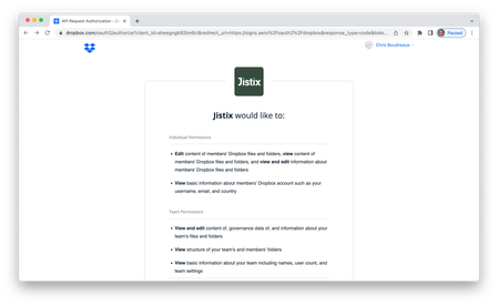 3 years agoThanks, that's helpful. It looks like your jistix-staging.com/oauth2/dropbox page is itself redirecting back to www.dropbox.com for some reason.