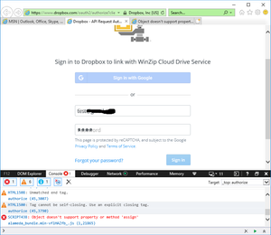 My app use IE to login to Dropbox with Auth2. But all the buttons in the Auth page are disabled. And i can see an JS error in the Console if IE 11. SCRIPT438: Object doesn't support property or meth...