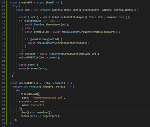 4 years agoWhen uploading files to Dropbox, you should just supply the raw binary data. In the code here, there are two things that look like they may be altering or affecting the format of the data you're sending: 1) 'base64: true' on your printToFileAsync method and 2) readAsStringAsync. Those methods aren't made by Dropbox though so I can't say what exactly they do or offer guidance on those, so I recommend referring to the documentation for those for information on using them accordingly.