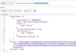 7 years agoIt looks like this Business team is using the new team space and member folders configuration. In that case, the folders inside the team's "shared workspace" won't be listed separately as team folders by /2/team/team_folder/list. You can instead list them by listing the contents of the team space. Please read the Namespace Guide for details on how this works.