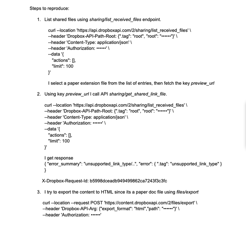 Lastly, the error "unsupported_link_type" from /2/sharing/get_shared_link_file is expected if the type of link is not supported, which would be the case with Paper docs.