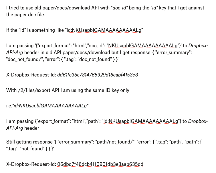 - 5-10 different 'X-Dropbox-Request-Id' response header values encountering the issue