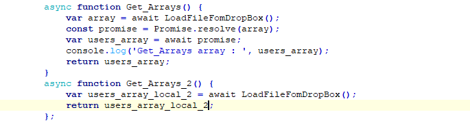 One more issue I am trying to resolve. As I mentioned previously I was able to download the file from dropbox and properly parse it into an array and access array elements within the async function I use to download the dropbox file. However I am having issues using the array outside of the async function LoadFileFromDropBox. It looks like it returns a promise not an array I can use outside the function. I have tried a few things get the array from the returned promise but unsuccessful. Here is the functions I am trying to work with :
