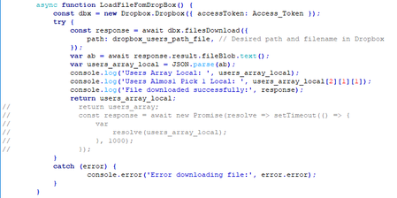 One more issue I am trying to resolve. As I mentioned previously I was able to download the file from dropbox and properly parse it into an array and access array elements within the async function I...