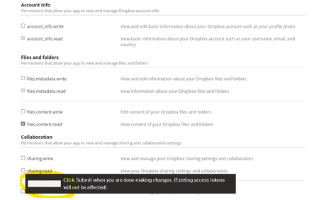 Error in call to API function "files/upload": Your app is not permitted to access this endpoint because it does not have the required scope 'files.content.write'. The owner of the app can enable the scope for the app using the Permissions tab on the App Console.