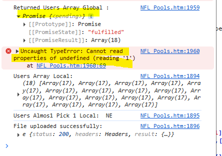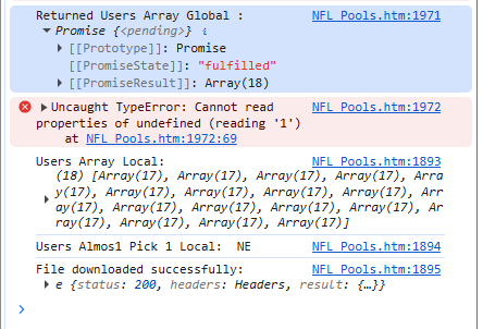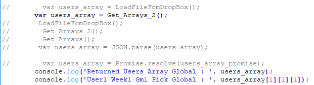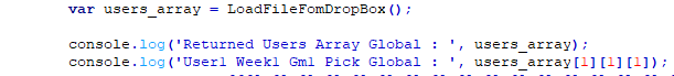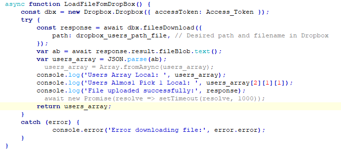 One more issue I am trying to resolve. As I mentioned previously I was able to download the file from dropbox and properly parse it into an array and access array elements within the async function I use to download the dropbox file. However I am having issues using the array outside of the async function LoadFileFromDropBox. It looks like it returns a promise not an array I can use outside the function. I have tried a few things get the array from the returned promise but unsuccessful. Here is the functions I am trying to work with :