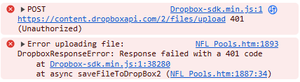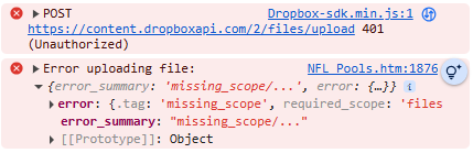 I am developing an html file for our group to do weekly picks online. I have to program working where the users can pick their own games. However I need a place to store and retrieve the information selected so other users can view current picks. I want to use Dropbox as my online repository. Through my internet searches, I created an app in Dropbox and made it available to anyone with the link. However when I try to implement a function to upload the file I get the following error :