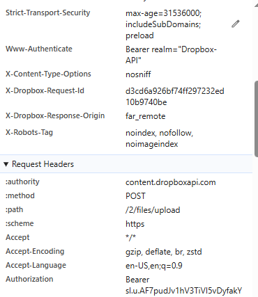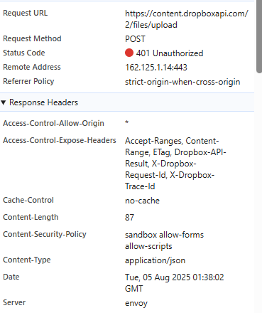 Thanks for you response. I had included a screenshot as well as my function that uploads to dropbox in my initial post. I will provide them again, and try to include more detail. In my html console this is the error message I receive (screenshot below) :