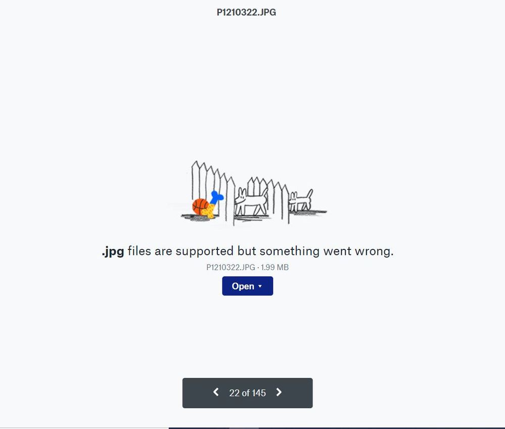 Two years ago I uploaded my entire engagement photo album to Dropbox. Today, when I tried to view the photos, I get an error message for each image: ".jpg files are supported but something went wrong."