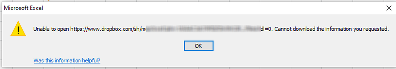 I am also having the same issue. Trying to create shared links in an excel sheet. All other hyperlinks work just fine. It is only the dropbox links that do not work.