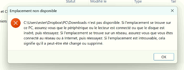 It looks like Windows is trying to redirect your Downloads folder to a Dropbox Backup path like Dropbox\PC\Downloads, but that folder no longer exists. When this happens, Windows can’t resolve the folder location and downloads will fail until the folder path is restored.