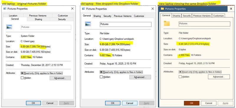 I am migrating a 7GB folder with approx. 3,000 photos from an Old laptop (Lenovo P51 Win10) to a New one (Lenovo P14s Win 11). Using Old laptop, I opened File Explorer and copied the Pictures directory to a new Dropbox folder. Viewing the directories' Properties windows using File Explorer, the contents are identical. But when viewing the same Dropbox folder on New laptop, it has eight fewer files. I've repeated the process twice with the same results. What is happening?