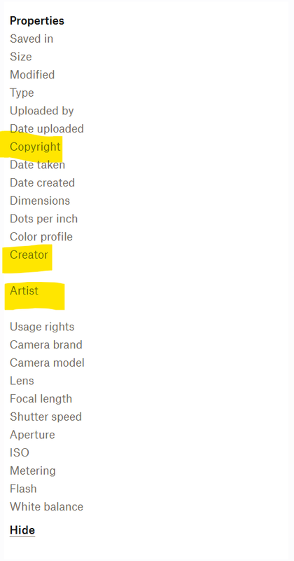 My client wants me to amend the information highlighted in yellow. 'Copyright' and 'Creator' shows in Bridge but I am unable to see the 'Artist' part anywhere in my Dropbox or Windows, Mac metadata preview as well as Adobe Bridge.