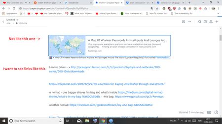 I've pasted a list (column, one above another) of urls into a Paper file (my way of storing large about of bookmarks - with my comments, in order to quickly look through them) - but some of the links automatically have converted into strange "Preview" images - half of which dont even have a picture on it, but they hide the initial link and make the whole file like 5 times longer, making it very hard to scroll through. I've managed to remove the images but "cutting" the whole thing, then pasting in - and as it converts to image pressing "Cmd+Z" - one by one. But it takes forever. Is there a way to prevent those preview-images from appearing from links?