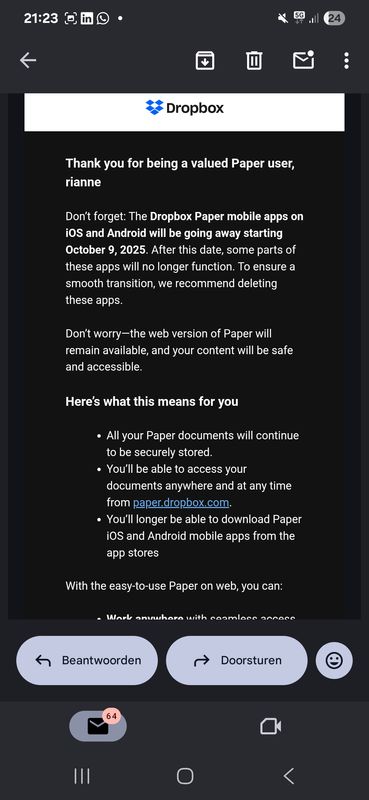I am suddenly not allowed to view my own files in dropbox paper. Im logged in, reinstalled dropbox paper twice, nothing works. Any help? Im using the free dropbox version, on my Android Phone. It starters yesterday when i was suddenly logged out for no reason. And logged in again,a and then its show the error i am not allowed tto view. When i create a New file the same probleem appears.