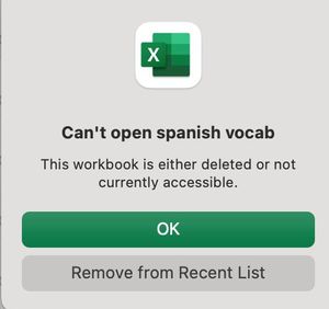 I did as you suggested for both the folder 'mabword' and the file 'spanish vocab'. Now, every file and folder has a small checkmark in a green circle to the right of the file/folder name in Finder. (see attached screenshots). However, when I try and open the file from Excel, I get the same error message (see attached.).