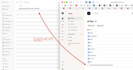 The first one is the app's current syncing status in order to make sure it's up-to-date. Can you check by hovering your mouse over the little Dropbox icon in your menu bar, next to your WiFi?