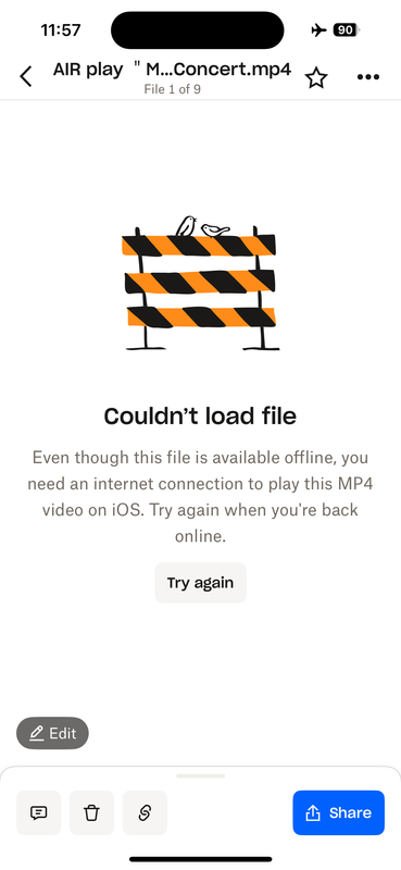 When synced to iphone (iphone 16 plus - iOS 18.3.1) the app (version 414.3.2) won't load or play the video - gives error that says it's missing file extension and to rename the file. However the file clearly has the extension in the name. This happens when the file is available offline (downloaded).
