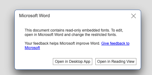My office shares and edits unlinked docs and I'm then responsible for accepting the edits and uploading the final doc to Dropbox. Recently, I've been unable to upload the doc with it keeping its formatting and fonts. It will be formatted correctly on my OS desktop but when I save it and upload it, the fonts in the preview are bold. When I then go to open it in word for the web, I get this error: