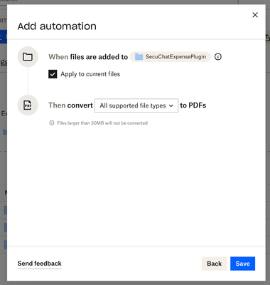 Can you give it a go again and let me know how it goes? Just click the folder where you’d like to add your automation> Click Add automation> then Convert Files to PDF. Note that you can personalize from there, and include files in all sub-folders as well.