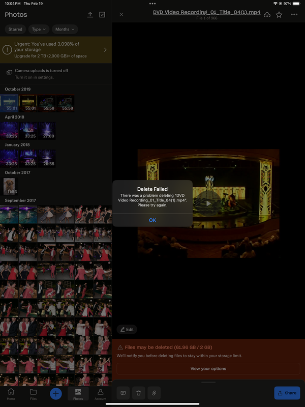 When I go to "Photos" one random folder of 915 photos is there and (10) 11min-55min long videos that are all from completely different "removed" folders are there and I get an error message that says "there was a problem deleting xyz. please try again." no matter which device I try to delete them on.