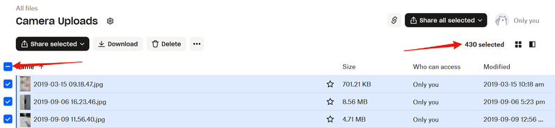 모든 파일을 선택하면 선택한 항목의 수가 파일 목록 위의 페이지 오른쪽에 나타납니다. 카운트는 선택한 모든 항목의 수입니다. 파일뿐만 아니라. 따라서 목록에있을 수있는 폴더를 선택하지 마십시오.