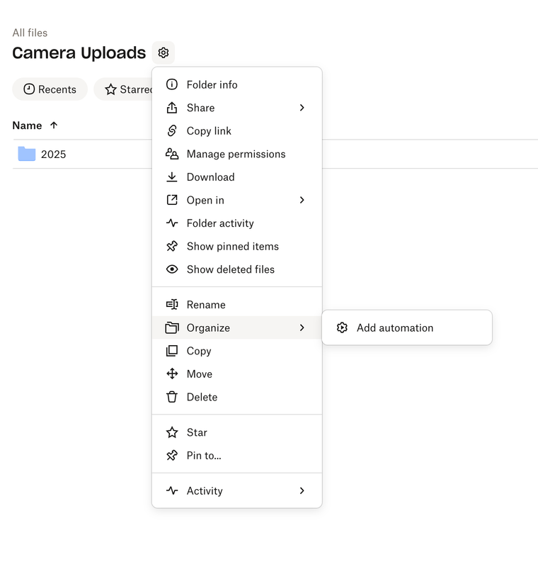 I read this can be done from the dropbox.com website, when clicking on the settings gear icon at the end of the folder name (Select Organize --> Click Set naming convention). I tried to do this, but I don't see this option. When I click on Organize, my only option is "Add automation".