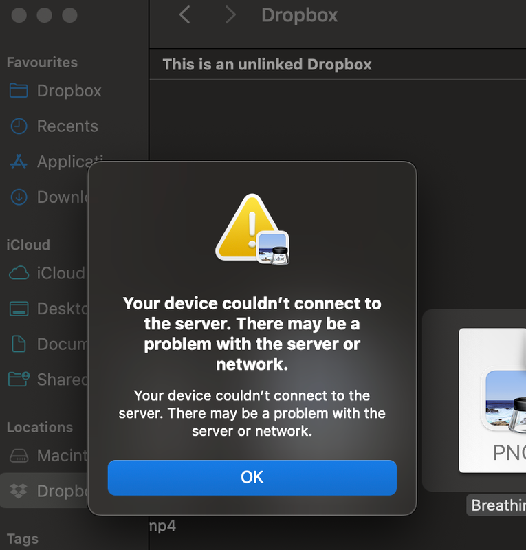 I cannot access files stored in the dropbox location untill I copy an individual file and paste it elsewhere, how do I fix this whenever I also try to connect it says Your device couldn't connect to server. There might be a problem with the server or network