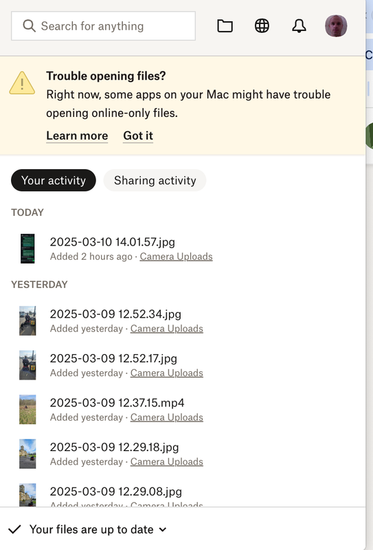 You cannot quite see, but there have been for a while, and unlike on my desktop machine with the exact same OS and DB install versions, NO sync symbols to the right of files or folders (green checkbox or blue spinning circle). The dropdown control panel, pictured, shows "Your files are up to date". My sync settings and screen showing the DB version are below that. Indeed, new files added to the synced folders on other computers do show up now. Yesterday they did not, but after a new clean reinstall at noon today they do. Tis morning I could access no files on the on-line-only-sync'd laptop due to that server/network error message reported above. Now I can.