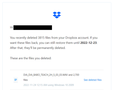 Deleted files are completely random, game files/saves, images, videos, project files. The date matches the time when I was online at my PC. But there wasn't even a popup asking me if I ...