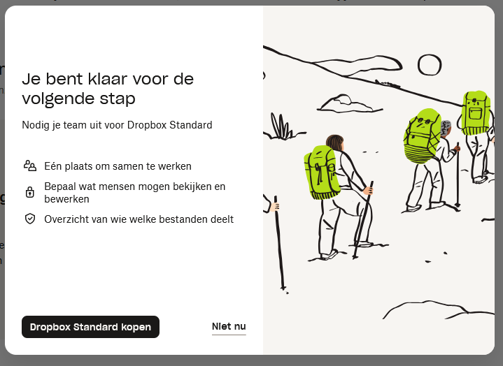 My colleagues have signed in to a free Dropbox account. Next I started the set up to share files/folders with them. So I went to settings > checked invited people > checked the could edit files etc. Then I clicked a button: add members. To my surprise I got a box saying we should buy Dropbox standard. Unfortunately I don't see how to continue.