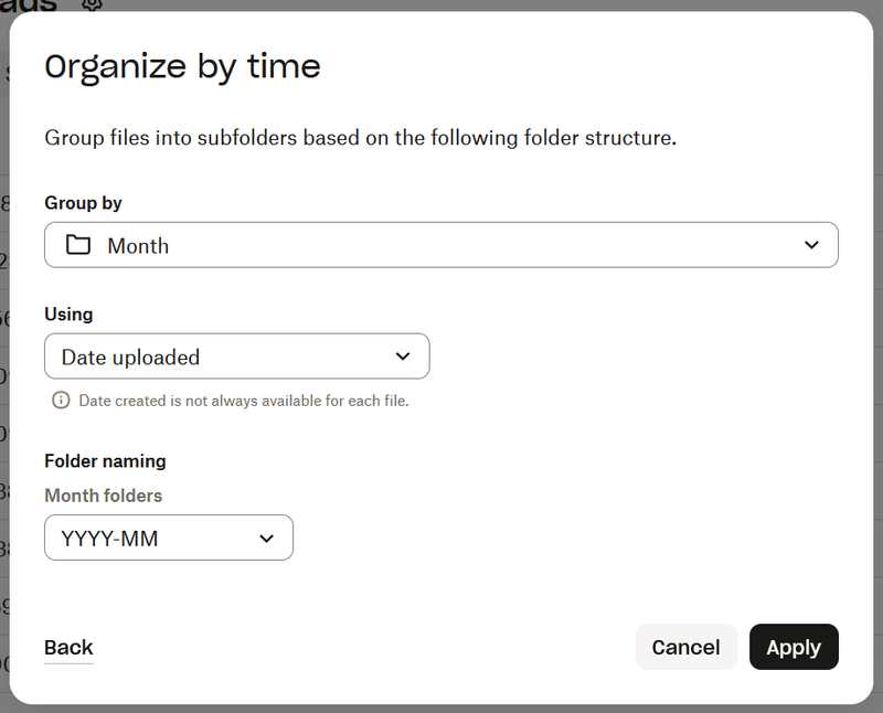 My proposal would help to sort the incoming photos in a proper way. I asked for an automatic creation of a folder like "2025_01" at the beginning of each month. The provider 1&1 Germany does it in this way. The photos should be filed into the monthly folders. Hence a better overview would be given.