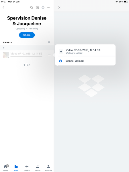 Hey Jq1, thanks for that screenshot!Would you mind just trying to clear the app cache to see if this helps at all with the steps in the spoiler below:Spoiler1. Open the Dropbox app on your device.2. Tap the Account tab.3. Tap the gear icon in the top left corner.4. Select the option to âClear cacheâ.After doing this, can you try manually uploading the video through the Dropbox app again using the â+â button along the bottom of the screen within the app.Let me know how it goes - Thanks!