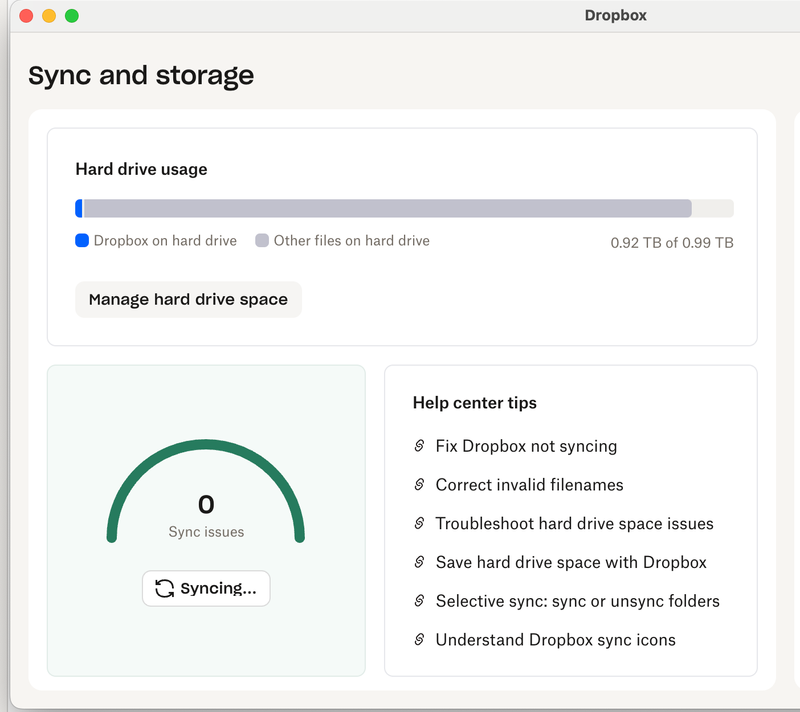I hope you can help. I'm trying to downlaod 3 large video files (105GB each) using the Dropbox Desktop App. When I check how much free space I have on my laptop hard drive I have 464 GB available. I've copied the 3 files I need to downlaod into a seperate dropbox folder and I'm syncing only to that folder. I double click on the first of the 3 files to sync and get the blue synching icon. The file gets to the last 20GB but then I get a message that I'm out of disk space. I've tried downloading the file from the web version too and the same thing happens - file gets to around 80% downloaded then stops. Screen shots are above - please can you assist.