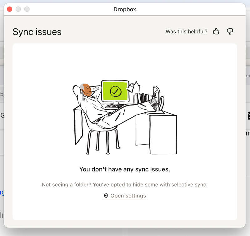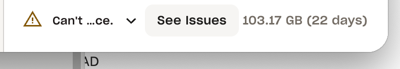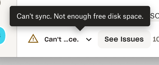 Hi Walter. Thank you for your quick response. The popup text says 'Can't sync. Not enough free disk space' When I click the 'see issues' button it says there are no issues - screenshots of both attached.