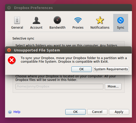 Can't Move the Dropbox Folder to Ext4 or NTFS partition