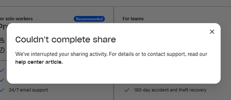 "Couldn't complete share – We’ve interrupted your sharing activity."