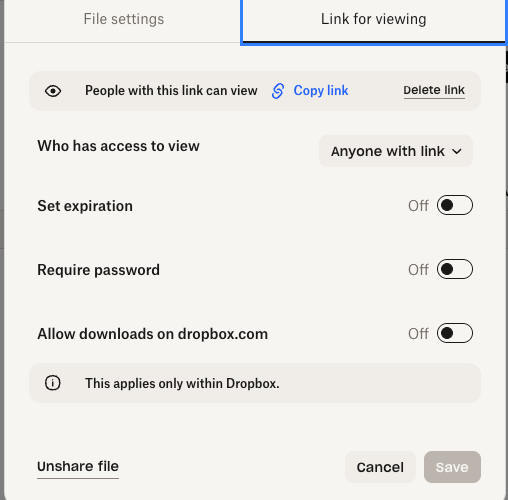 I have the essentials plan but I do not have the feature to disable downloads. I have the "allow downloads on dropbox.com" toggled off(see picture) but that doesn't work because someone can still download it. Can someone point to me where is this "disable download" feature that I see online? Does it even exist within my current plan? Any help would be greatly appreciated.