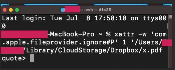 I tried the Terminal prompts, but maybe I didn't do it correctly (I copied the instruction and replaced it with a file I had on my main dropbox folder) but it says "no such file". I tried a bunch of other file names/renamed them and tried again, but still the same, so I gave up.