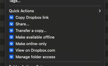 Hi Hannah — thanks for these steps. I have just tried. The "Dropbox finder integration" was the only available selection in "Finder extensions". I unchecked, relaunched Finder, and then went to redo the steps to check it, and relaunched finder. Still the same. Then I tried to restart the computer. Still the same... :(