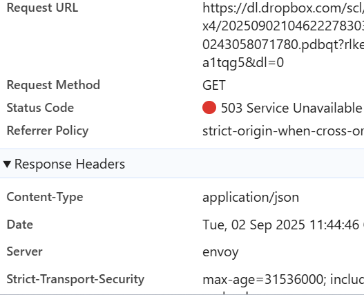 I am encountering a 503 Service Unavailable error when trying to fetch files from Dropbox shared links programmatically using the fetch() API in my web application. The same link works fine in a browser, but fails when accessed through code. I have already converted the link to use dl=1 for direct downloads. This error happens even for small files, so I am unsure if the issue is due to missing or incorrect request headers, Dropbox blocking automated requests, temporary server downtime, or rate limiting for multiple downloads. Additionally, I would like to understand if there are any restrictions for large files or bandwidth limits that could cause this error. Could you provide guidance on the correct way to perform programmatic downloads from Dropbox without encountering these errors.