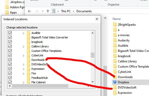 Dropbox folder missing from indexed locations for searching on Windows 10