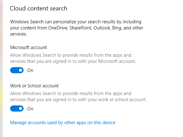 Settings > Privacy & security > Searching permissions > Cloud content search
