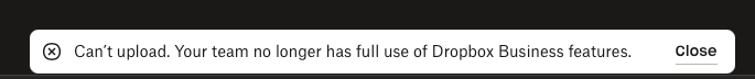 Error "Can't upload. Your team no longer has full use of Dropbox Business features.